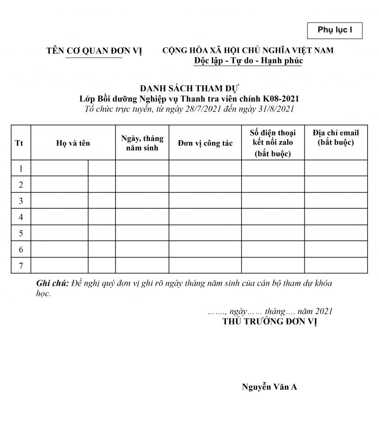 Đề nghị đơn vị cử người tham dự khóa học. Để việc tổ chức khóa học theo đúng tiến độ, Trường Cán bộ Thanh tra kính đề nghị Thanh tra các tỉnh, thành phố tổng hợp danh sách học viên tham gia khóa học theo mẫu đính kèm (Phụ lục I) cử Trưởng đoàn để thuận tiện cho việc liên hệ và gửi về địa chỉ hòm thư điện tử: phongdaotaotcbtt@gmail.com trước ngày 21/7/2021.