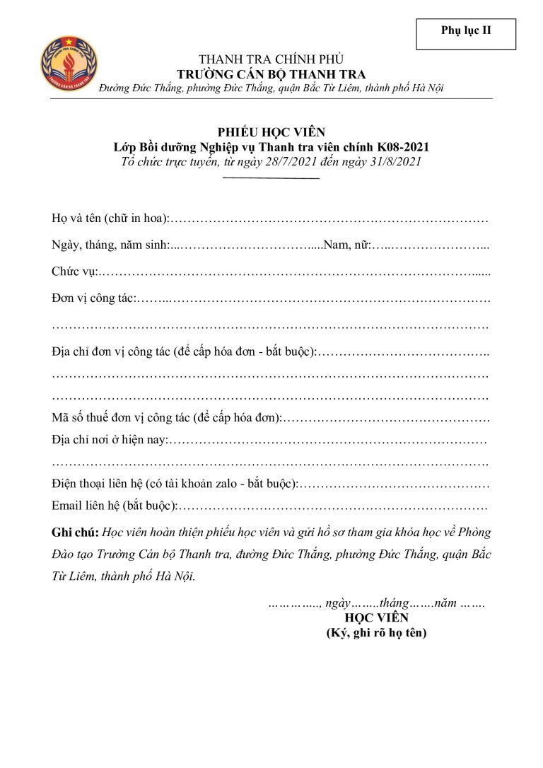 (Học viên tham gia khóa học gửi hồ sơ về địa chỉ: Phòng Đào tạo Trường Cán bộ Thanh tra, đường Đức Thắng, phường Đức Thắng, quận Bắc Từ Liêm , thành phố Hà Nội trước ngày 23/7/2021).