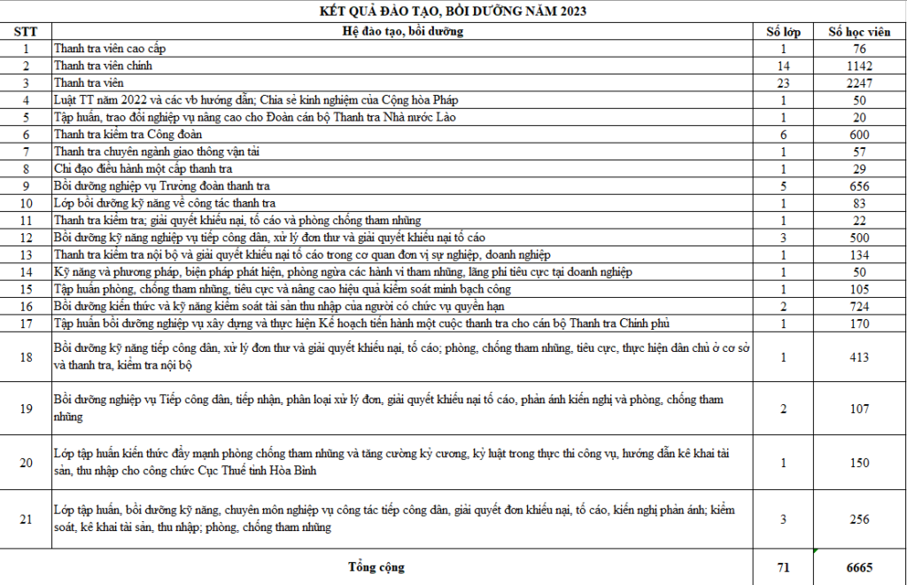 Đáng chú ý, các chương trình đào tạo Thanh tra viên, Thanh tra viên chính và Thanh tra viên tiếp tục thu hút số lượng lớn học viên, với: 23 lớp Thanh tra viên (2.247 học viên); 14 lớp Thanh tra viên chính (1.142 học viên) và 1 lớp Thanh tra viên cao cấp (76 học viên).