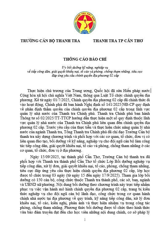 Sáng ngày 15/9, tại Cần Thơ, Trường Cán bộ Thanh tra phối hợp với Thanh tra thành phố khai giảng Lớp Bồi dưỡng nghiệp vụ tiếp công dân, xử lý đơn, giải quyết khiếu nại, tố cáo, phòng, chống tham… Đọc Thêm